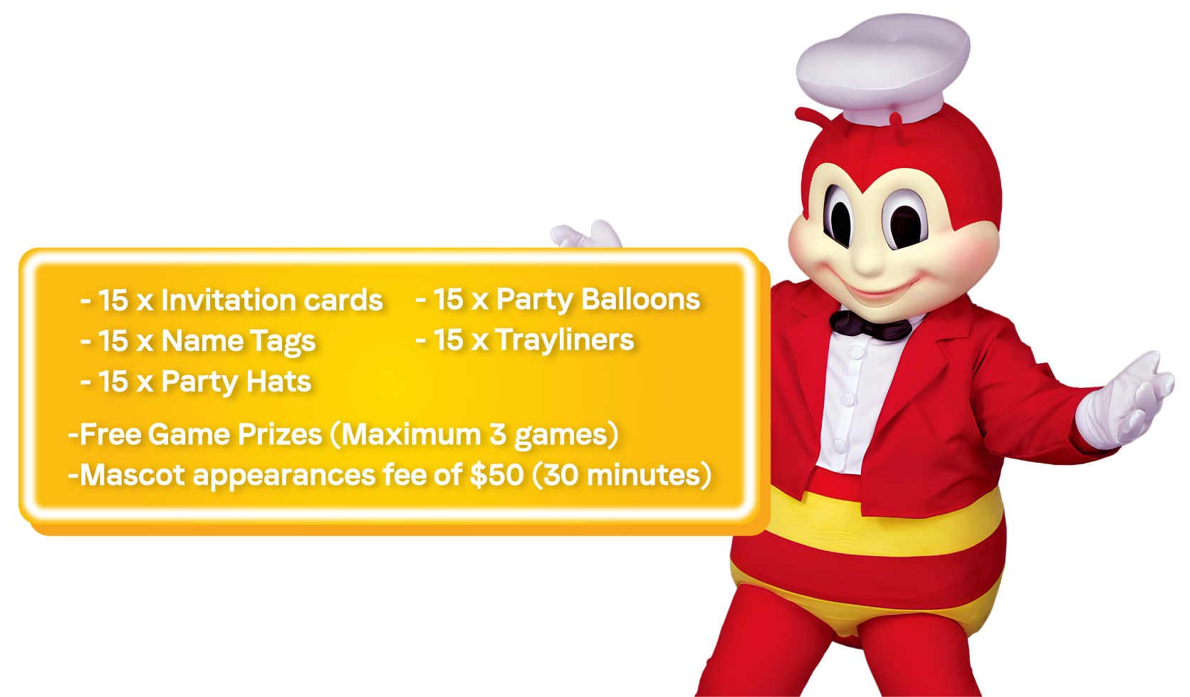 Celebrate your birthday at Jollibee and enjoy a jolly filled day with games, mascot appearance, surprise gift and more!